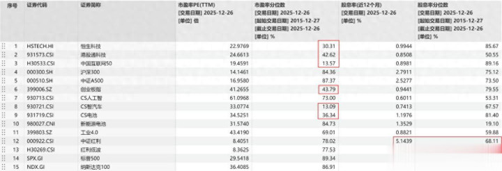 相关指数的估值情况详见下表。